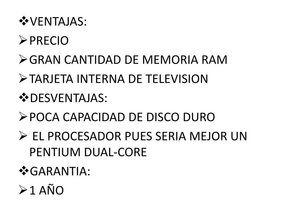 VENTAJAS: • PRECIO • GRAN CANTIDAD DE MEMORIA RAM • TARJETA INTERNA DE TELEVISION • DESVENTAJAS: • POCA CAPACIDAD DE DISCO DURO • EL PROCESADOR PUES SERIA MEJOR UN Pentium Dual-Core • GARANTIA: • 1 AÑO