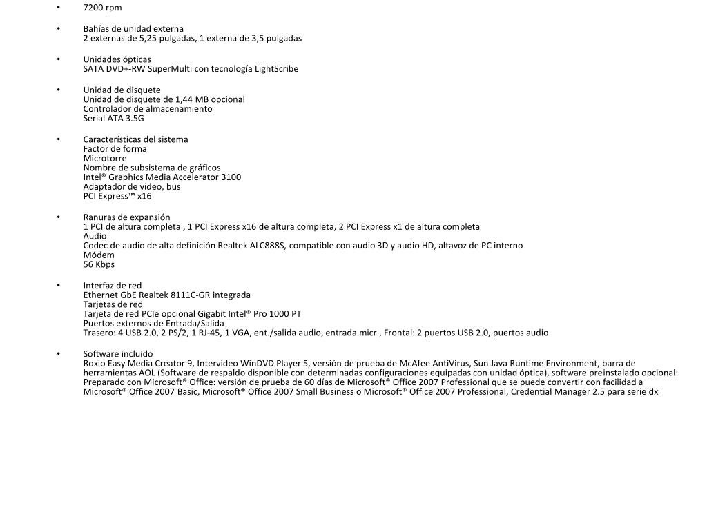 7200 rpm • Bahías de unidad externa2 externas de 5,25 pulgadas, 1 externa de 3,5 pulgadas • Unidades ópticasSATA DVD+-RW SuperMulti con tecnología LightScribe • Unidad de disqueteUnidad de disquete de 1,44 MB opcionalControlador de almacenamientoSerial ATA 3.5G • Características del sistemaFactor de formaMicrotorreNombre de subsistema de gráficosIntel® Graphics Media Accelerator 3100Adaptador de video, busPCI Express™ x16 • Ranuras de expansión1 PCI de altura completa , 1 PCI Express x16 de altura completa, 2 PCI Express x1 de altura completaAudioCodec de audio de alta definición Realtek ALC888S, compatible con audio 3D y audio HD, altavoz de PC internoMódem56 Kbps • Interfaz de redEthernet GbERealtek 8111C-GR integradaTarjetas de redTarjeta de red PCIe opcional Gigabit Intel® Pro 1000 PTPuertos externos de Entrada/SalidaTrasero: 4 USB 2.0, 2 PS/2, 1 RJ-45, 1 VGA, ent./salida audio, entrada micr., Frontal: 2 puertos USB 2.0, puertos audio • Software incluidoRoxioEasy Media Creator 9, IntervideoWinDVD Player 5, versión de prueba de McAfeeAntiVirus, Sun Java RuntimeEnvironment, barra de herramientas AOL (Software de respaldo disponible con determinadas configuraciones equipadas con unidad óptica), software preinstalado opcional: Preparado con Microsoft® Office: versión de prueba de 60 días de Microsoft® Office 2007 Professional que se puede convertir con facilidad a Microsoft® Office 2007 Basic, Microsoft® Office 2007 Small Business o Microsoft® Office 2007 Professional, Credential Manager 2.5 para serie dx