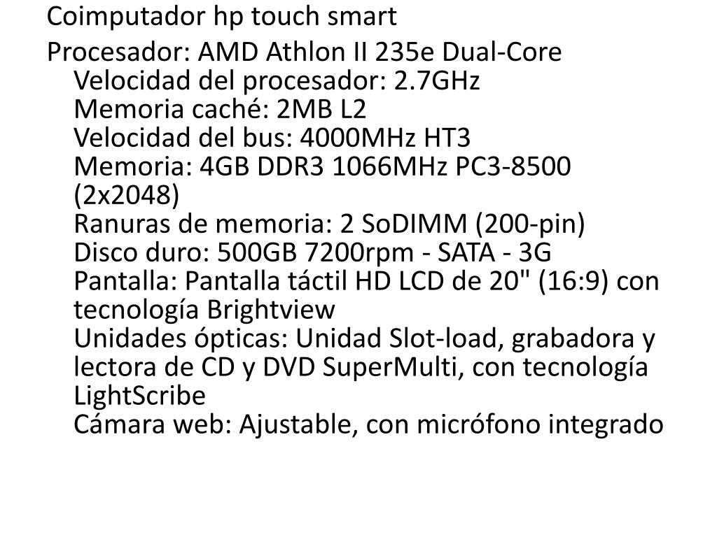 Coimputadorhp Procesador: AMD Athlon II 235e Dual-CoreVelocidad del procesador: 2.7GHzMemoria caché: 2MB L2Velocidad del bus: 4000MHz HT3Memoria: 4GB DDR3 1066MHz PC3-8500 (2x2048)Ranuras de memoria: 2 SoDIMM (200-pin)Disco duro: 500GB 7200rpm - SATA - 3GPantalla: Pantalla táctil HD LCD de 20" (16:9) con tecnología BrightviewUnidades ópticas: Unidad Slot-load, grabadora y lectora de CD y DVD SuperMulti, con tecnología LightScribeCámara web: Ajustable, con micrófono integrado