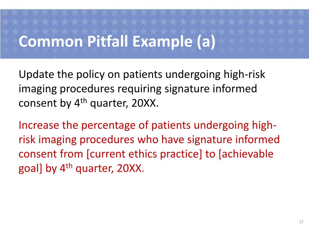 Common Pitfall Example (a) Update the policy on patients undergoing high-risk imaging procedures requiring signature informed consent by 4th quarter, 20XX. Increase the percentage of patients undergoing high-risk imaging procedures who have signature informed consent from [current ethics practice] to [achievable goal] by 4th quarter, 20XX.