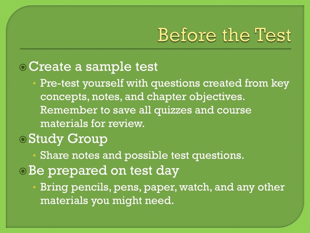Before the Test • Create a sample test • Pre-test yourself with questions created from key concepts, notes, and chapter objectives. Remember to save all quizzes and course materials for review. • Study Group • Share notes and possible test questions. • Be prepared on test day • Bring pencils, pens, paper, watch, and any other materials you might need.