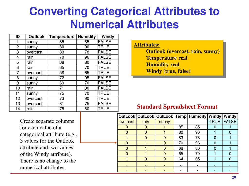 Converting Categorical Attributes to Numerical Attributes Attributes: Outlook (overcast, rain, sunny) Temperature real Humidity real Windy (true, false) Standard Spreadsheet Format Create separate columns for each value of a categorical attribute (e.g., 3 values for the Outlook attribute and two values of the Windy attribute). There is no change to the numerical attributes.