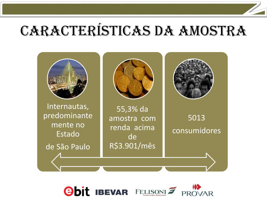 Características da amostra • 55,3% da amostra com renda acima de R$3.901/mês • 5013 • consumidores • Internautas, predominantemente no Estado • de São Paulo