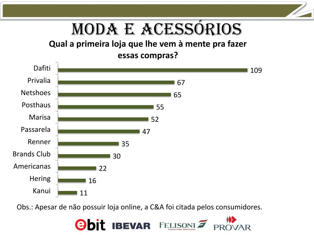 Modaeacessórios 11,9% 10,7% 7,8% 7,5% Obs.: Apesar de não possuir loja online, a C&A foi citada pelos consumidores.