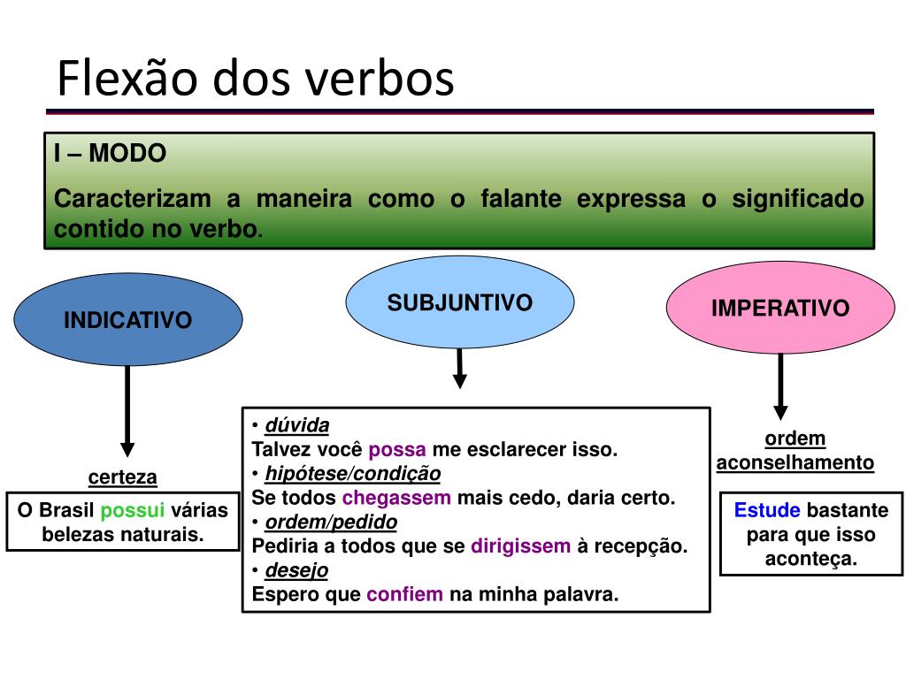 Flexão dos verbos I – MODO Caracterizam a maneira como o falante expressa o significado contido no verbo. SUBJUNTIVO IMPERATIVO INDICATIVO • dúvida • Talvez você possa me esclarecer isso. • hipótese/condição • Se todos chegassem mais cedo, daria certo. • ordem/pedido • Pediria a todos que se dirigissem à recepção. • desejo • Espero que confiem na minha palavra. ordem aconselhamento certeza O Brasil possui várias belezas naturais. Estude bastante para que isso aconteça. Língua Portuguesa