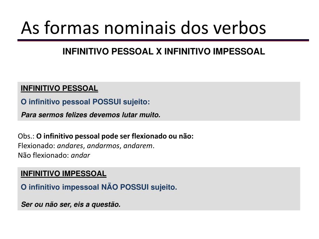 As formas nominais dos verbos INFINITIVO PESSOAL X INFINITIVO IMPESSOAL INFINITIVO PESSOAL O infinitivo pessoal POSSUI sujeito: Para sermos felizes devemos lutar muito. Obs.: O infinitivo pessoal pode ser flexionado ou não: Flexionado: andares, andarmos, andarem. Não flexionado: andar INFINITIVO IMPESSOAL O infinitivo impessoal NÃO POSSUI sujeito. Ser ou não ser, eis a questão.