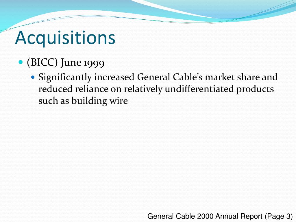 Acquisitions • (BICC) June 1999 • Significantly increased General Cable’s market share and reduced reliance on relatively undifferentiated products such as building wire General Cable 2000 Annual Report (Page 3)