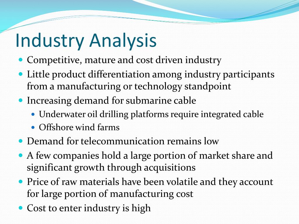 Industry Analysis • Competitive, mature and cost driven industry • Little product differentiation among industry participants from a manufacturing or technology standpoint • Increasing demand for submarine cable • Underwater oil drilling platforms require integrated cable • Offshore wind farms • Demand for telecommunication remains low • A few companies hold a large portion of market share and significant growth through acquisitions • Price of raw materials have been volatile and they account for large portion of manufacturing cost • Cost to enter industry is high