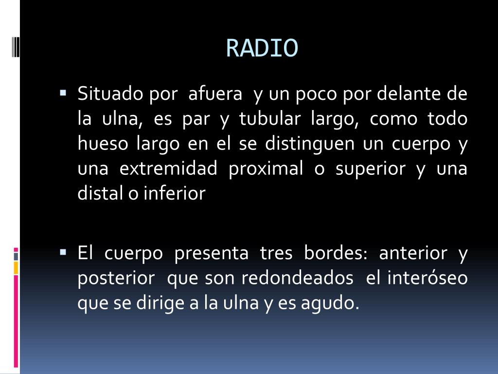 RADIO • Situado por afuera y un poco por delante de la ulna, es par y tubular largo, como todo hueso largo en el se distinguen un cuerpo y una extremidad proximal o superior y una distal o inferior • El cuerpo presenta tres bordes: anterior y posterior que son redondeados el interóseo que se dirige a la ulna y es agudo.