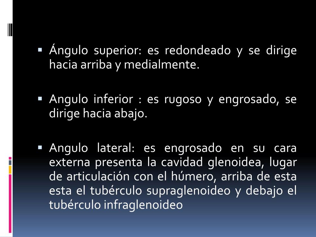 Ángulo superior: es redondeado y se dirige hacia arriba y medialmente. • Angulo inferior : es rugoso y engrosado, se dirige hacia abajo. • Angulo lateral: es engrosado en su cara externa presenta la cavidad glenoidea, lugar de articulación con el húmero, arriba de esta esta el tubérculo supraglenoideo y debajo el tubérculo infraglenoideo