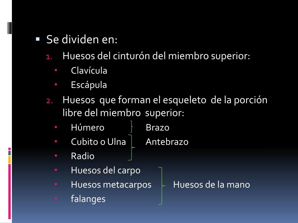 Se dividen en: • Huesos del cinturón del miembro superior: • Clavícula • Escápula • Huesos que forman el esqueleto de la porción libre del miembro superior: • Húmero Brazo • Cubito o Ulna Antebrazo • Radio • Huesos del carpo • Huesos metacarpos Huesos de la mano • falanges