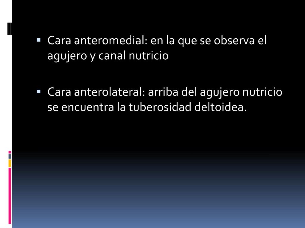 Cara anteromedial: en la que se observa el agujero y canal nutricio • Cara anterolateral: arriba del agujero nutricio se encuentra la tuberosidad deltoidea.
