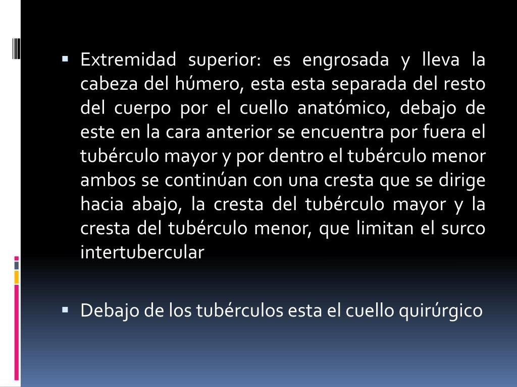 Extremidad superior: es engrosada y lleva la cabeza del húmero, esta esta separada del resto del cuerpo por el cuello anatómico, debajo de este en la cara anterior se encuentra por fuera el tubérculo mayor y por dentro el tubérculo menor ambos se continúan con una cresta que se dirige hacia abajo, la cresta del tubérculo mayor y la cresta del tubérculo menor, que limitan el surco intertubercular • Debajo de los tubérculos esta el cuello quirúrgico