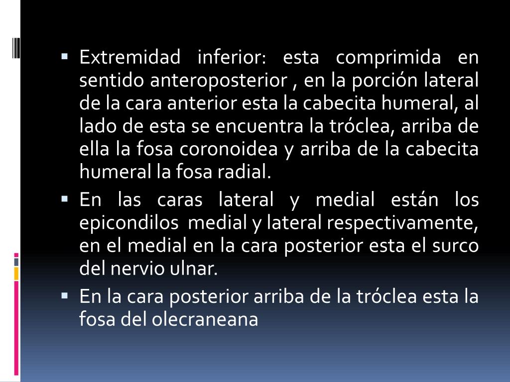 Extremidad inferior: esta comprimida en sentido anteroposterior , en la porción lateral de la cara anterior esta la cabecita humeral, al lado de esta se encuentra la tróclea, arriba de ella la fosa coronoidea y arriba de la cabecita humeral la fosa radial. • En las caras lateral y medial están los epicondilos medial y lateral respectivamente, en el medial en la cara posterior esta el surco del nervio ulnar. • En la cara posterior arriba de la tróclea esta la fosa del olecraneana