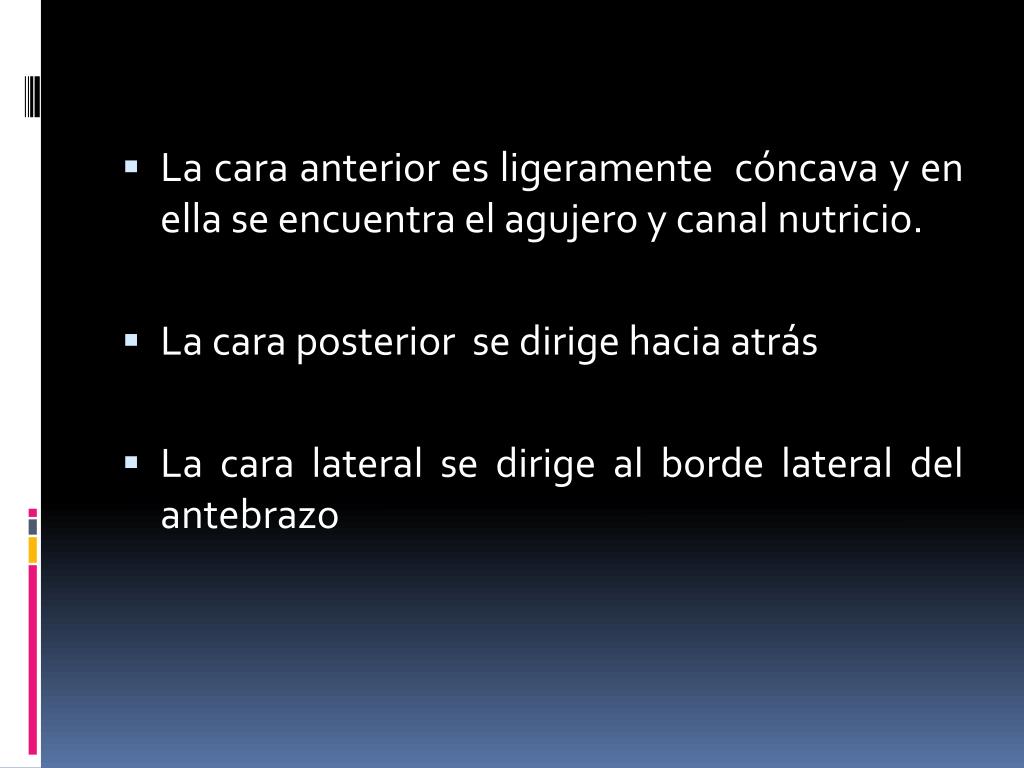 La cara anterior es ligeramente cóncava y en ella se encuentra el agujero y canal nutricio. • La cara posterior se dirige hacia atrás • La cara lateral se dirige al borde lateral del antebrazo