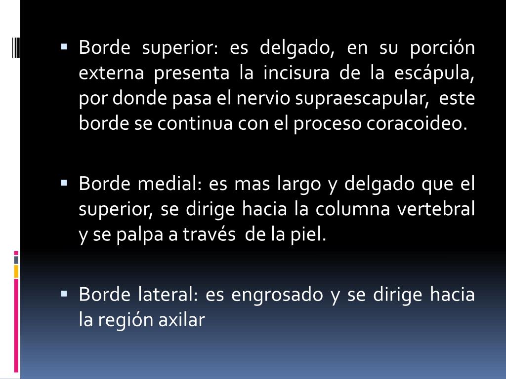 Borde superior: es delgado, en su porción externa presenta la incisura de la escápula, por donde pasa el nervio supraescapular, este borde se continua con el proceso coracoideo. • Borde medial: es mas largo y delgado que el superior, se dirige hacia la columna vertebral y se palpa a través de la piel. • Borde lateral: es engrosado y se dirige hacia la región axilar