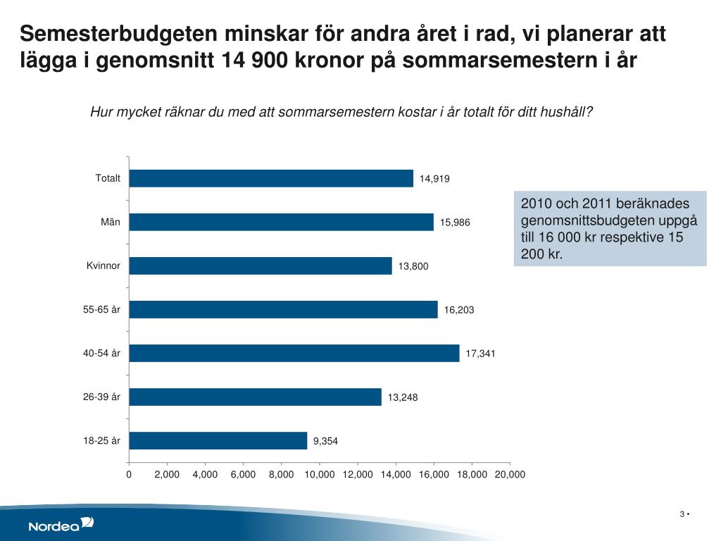 Semesterbudgeten minskar för andra året i rad, vi planerar att lägga i genomsnitt 14 900 kronor på sommarsemestern i år Hur mycket räknar du med att sommarsemestern kostar i år totalt för ditt hushåll? 2010 och 2011 beräknades genomsnittsbudgeten uppgå till 16 000 kr respektive 15 200 kr.