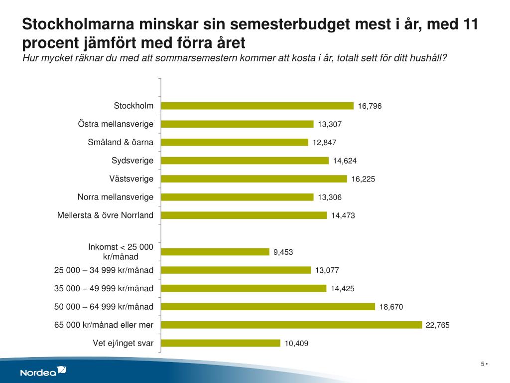 Bland personer som upplever att de inte har kontroll över sin ekonomi är budgeten försiktigare Hur mycket räknar du med att sommarsemestern kostar i år totalt för ditt hushåll? Sydsvenskar och Norrlänningar i denna grupp drar ner med runt 5 000 kr och Stockholmarna med 3 500 kr