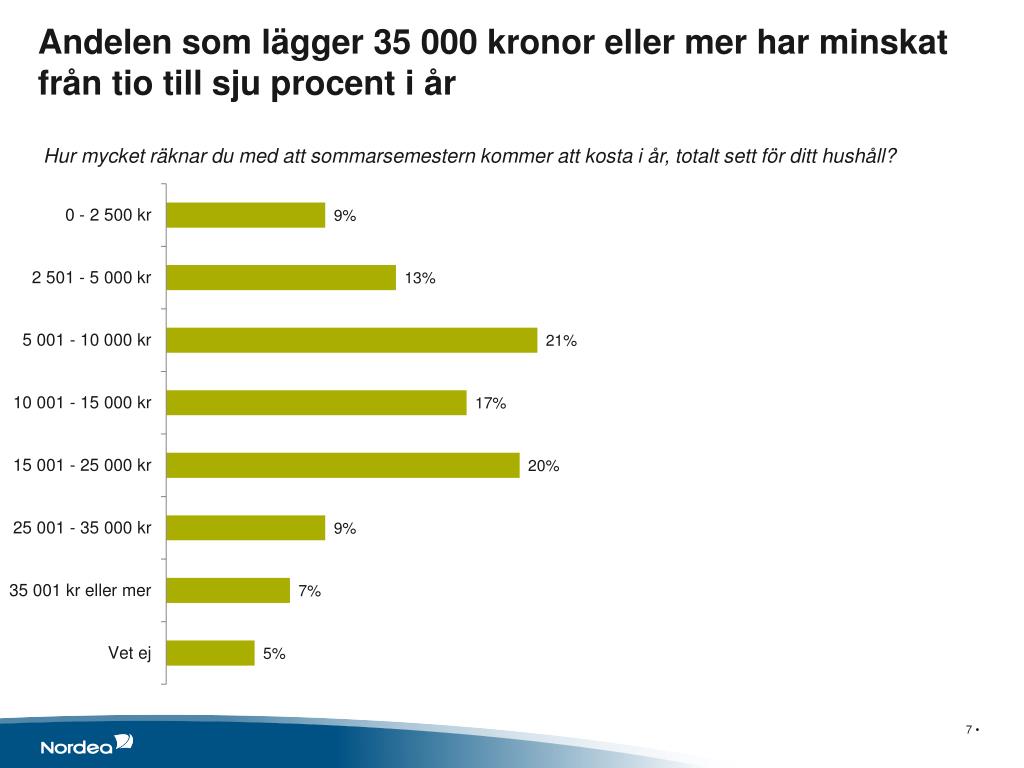 Andelen som lägger 35 000 kronor eller mer har minskat från tio till sju procent i år Hur mycket räknar du med att sommarsemestern kommer att kosta i år, totalt sett för ditt hushåll?