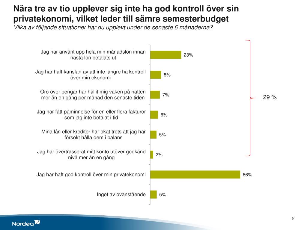 Nära tre av tio upplever sig inte ha god kontroll över sin privatekonomi, vilket leder till sämre semesterbudgetVilka av följande situationer har du upplevt under de senaste 6 månaderna? 29 %