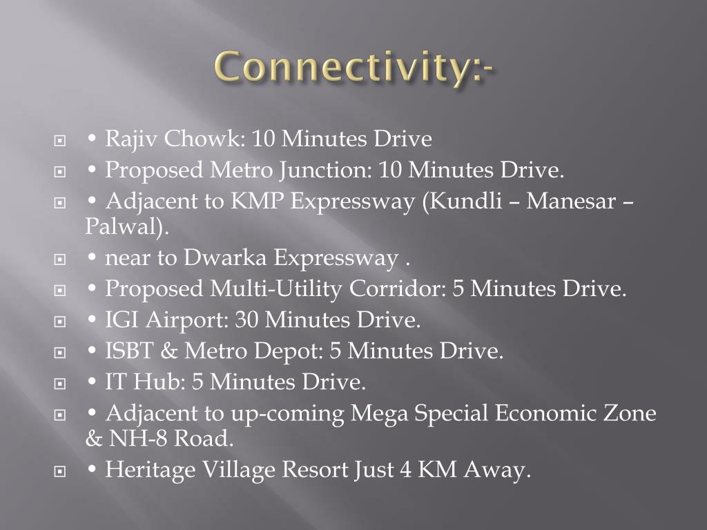 Connectivity:- • • Rajiv Chowk: 10 Minutes Drive • • Proposed Metro Junction: 10 Minutes Drive. • • Adjacent to KMP Expressway (Kundli – Manesar – Palwal). • • near to Dwarka Expressway . • • Proposed Multi-Utility Corridor: 5 Minutes Drive. • • IGI Airport: 30 Minutes Drive. • • ISBT & Metro Depot: 5 Minutes Drive. • • IT Hub: 5 Minutes Drive. • • Adjacent to up-coming Mega Special Economic Zone & NH-8 Road. • • Heritage Village Resort Just 4 KM Away.