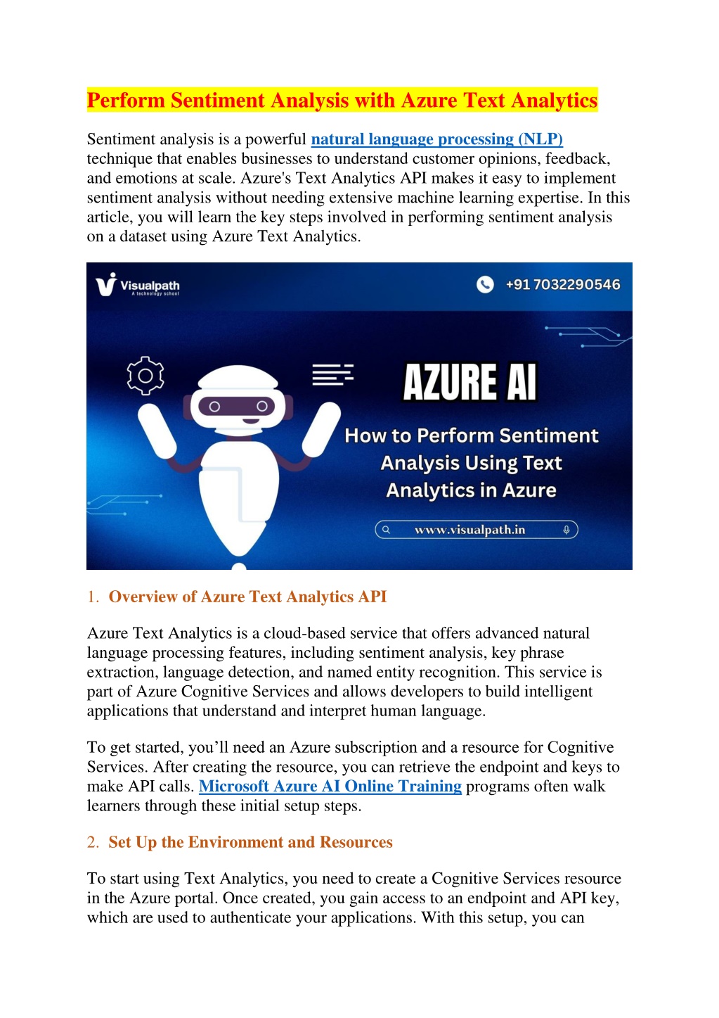 Perform Sentiment Analysis with Azure Text Analytics Sentiment analysis is a powerful natural language processing (NLP) technique that enables businesses to understand customer opinions, feedback, and emotions at scale. Azure's Text Analytics API makes it easy to implement sentiment analysis without needing extensive machine learning expertise. In this article, you will learn the key steps involved in performing sentiment analysis on a dataset using Azure Text Analytics. 1.Overview of Azure Text Analytics API Azure Text Analytics is a cloud-based service that offers advanced natural language processing features, including sentiment analysis, key phrase extraction, language detection, and named entity recognition. This service is part of Azure Cognitive Services and allows developers to build intelligent applications that understand and interpret human language. To get started, you’ll need an Azure subscription and a resource for Cognitive Services. After creating the resource, you can retrieve the endpoint and keys to make API calls. Microsoft Azure AI Online Training programs often walk learners through these initial setup steps. 2.Set Up the Environment and Resources To start using Text Analytics, you need to create a Cognitive Services resource in the Azure portal. Once created, you gain access to an endpoint and API key, which are used to authenticate your applications. With this setup, you can