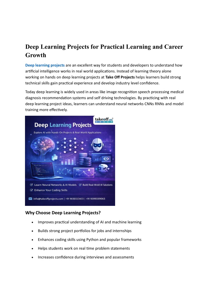 Deep Learning Projects for Practical Learning and Career Growth Deep learning projects are an excellent way for students and developers to understand how artificial intelligence works in real world applications. Instead of learning theory alone working on hands on deep learning projects at Take Off Projects helps learners build strong technical skills gain practical experience and develop industry level confidence. Today deep learning is widely used in areas like image recognition speech processing medical diagnosis recommendation systems and self driving technologies. By practicing with real deep learning project ideas, learners can understand neural networks CNNs RNNs and model training more effectively. Why Choose Deep Learning Projects? •Improves practical understanding of AI and machine learning •Builds strong project portfolios for jobs and internships •Enhances coding skills using Python and popular frameworks •Helps students work on real time problem statements •Increases confidence during interviews and assessments