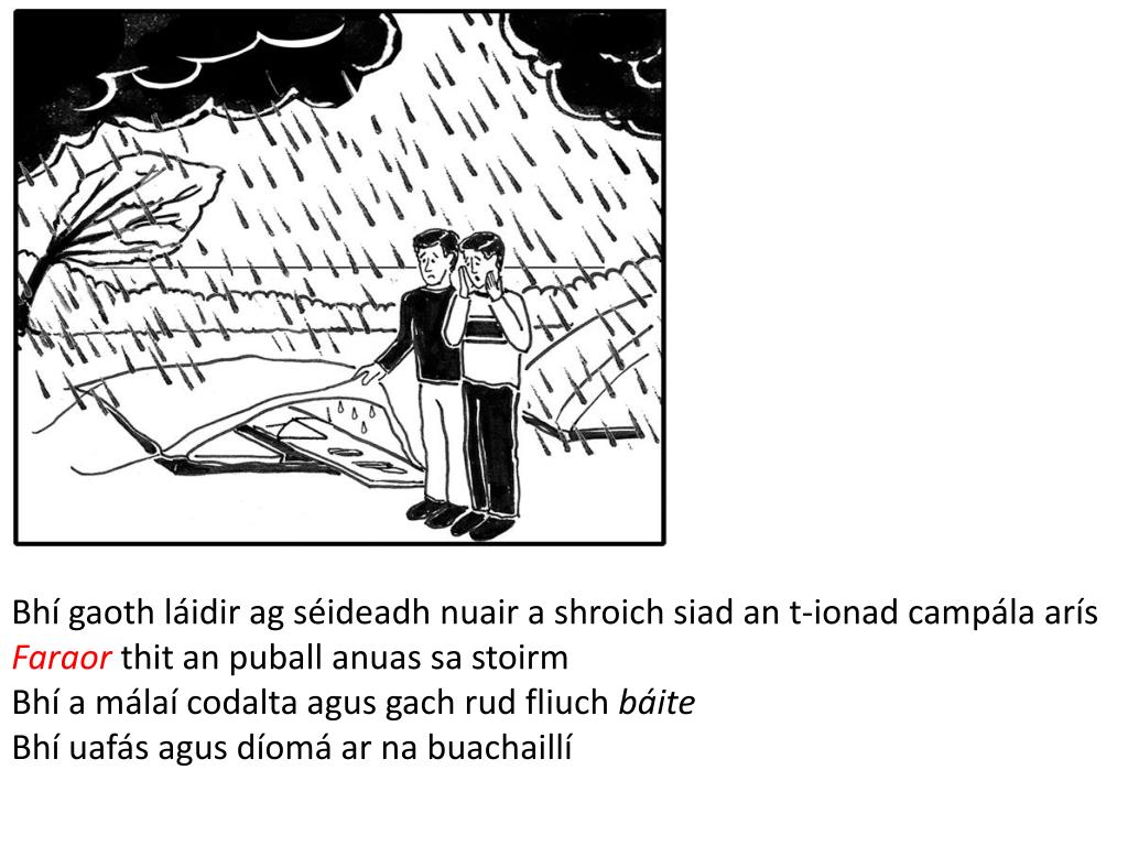 Bhí gaoth láidir ag séideadh nuair a shroich siad an t-ionad campála arís Faraor thit an puball anuas sa stoirm Bhí a málaí codalta agus gach rud fliuch báite Bhí uafás agus díomá ar na buachaillí
