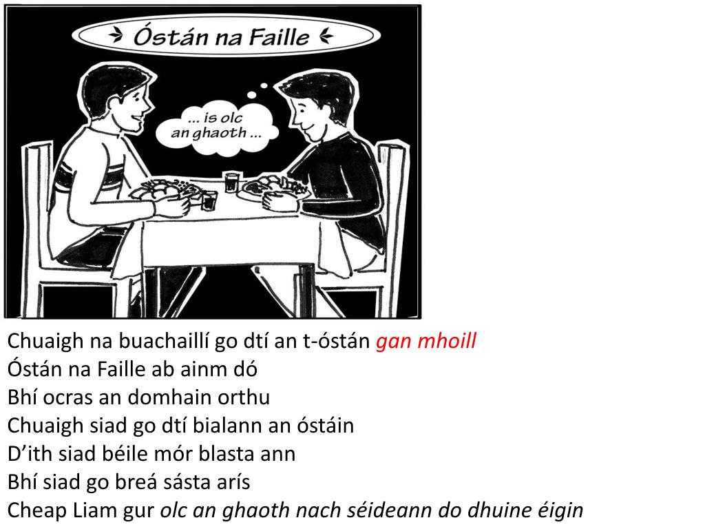 Ceisteanna: Cad ab ainm don óstán? Cá raibh na buachaillí? Cad a bhí á dhéanamh acu? An raibh siad sásta? Freagraí: Óstán na Faille ab ainm dó Bhí siad i mbialann an óstáin Bhí siad ag ithe dinnéir Bhí siad an-sásta Foghraíocht: Óstán na Faille