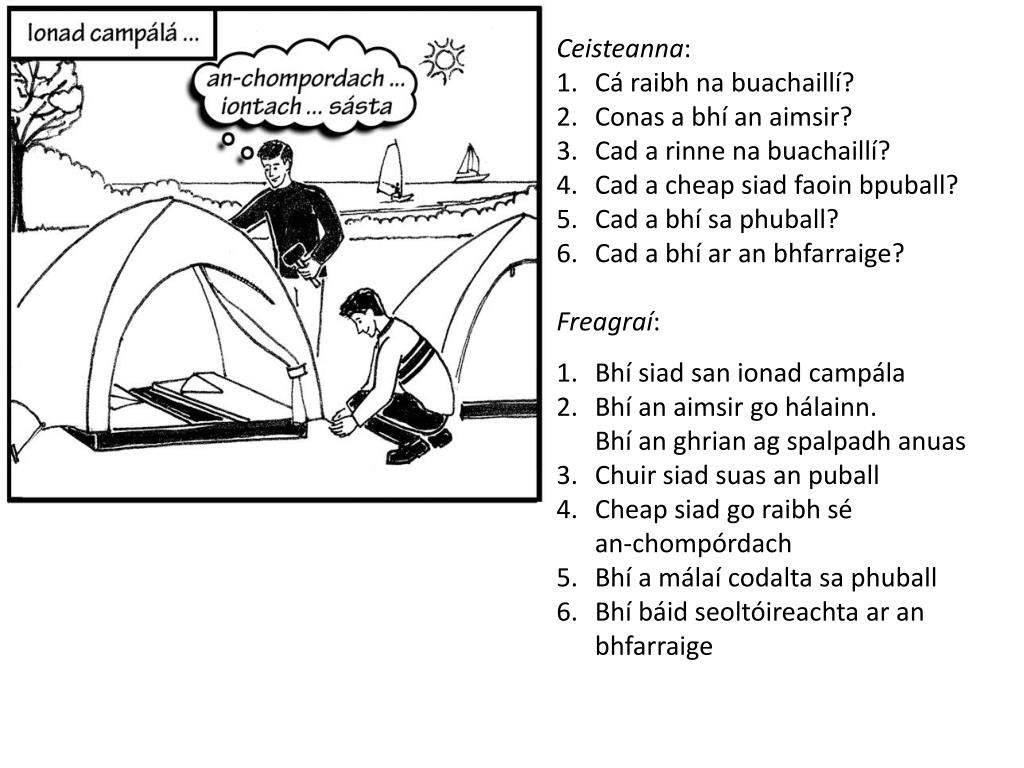 Ceisteanna: Cá raibh na buachaillí? Conas a bhí an aimsir? Cad a rinne na buachaillí? Cad a cheap siad faoin bpuball? Cad a bhí sa phuball? Cad a bhí ar an bhfarraige? Freagraí: Bhí siad san ionad campála Bhí an aimsir go hálainn. Bhí an ghrian ag spalpadh anuas Chuir siad suas an puball Cheap siad go raibh sé an-chompórdach Bhí a málaí codalta sa phuball Bhí báid seoltóireachta ar an bhfarraige