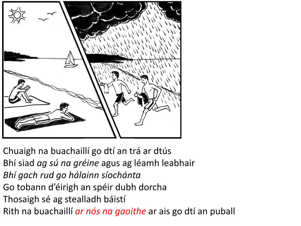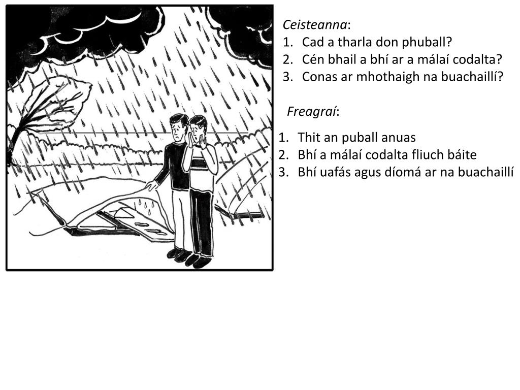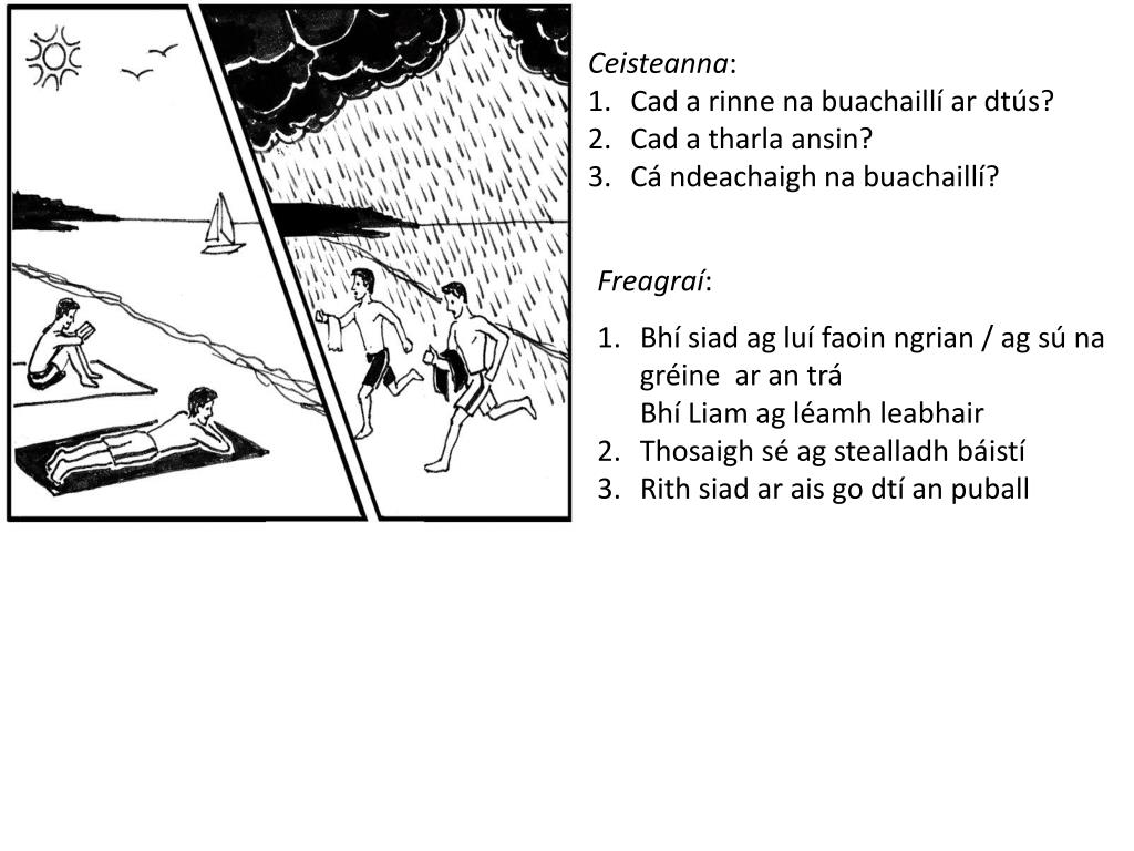 Ceisteanna: Cad a rinne na buachaillí ar dtús? Cad a tharla ansin? Cá ndeachaigh na buachaillí? Freagraí: Bhí siad ag luí faoin ngrian / ag sú na gréine ar an trá Bhí Liam ag léamh leabhair Thosaigh sé ag stealladh báistí Rith siad ar ais go dtí an puball