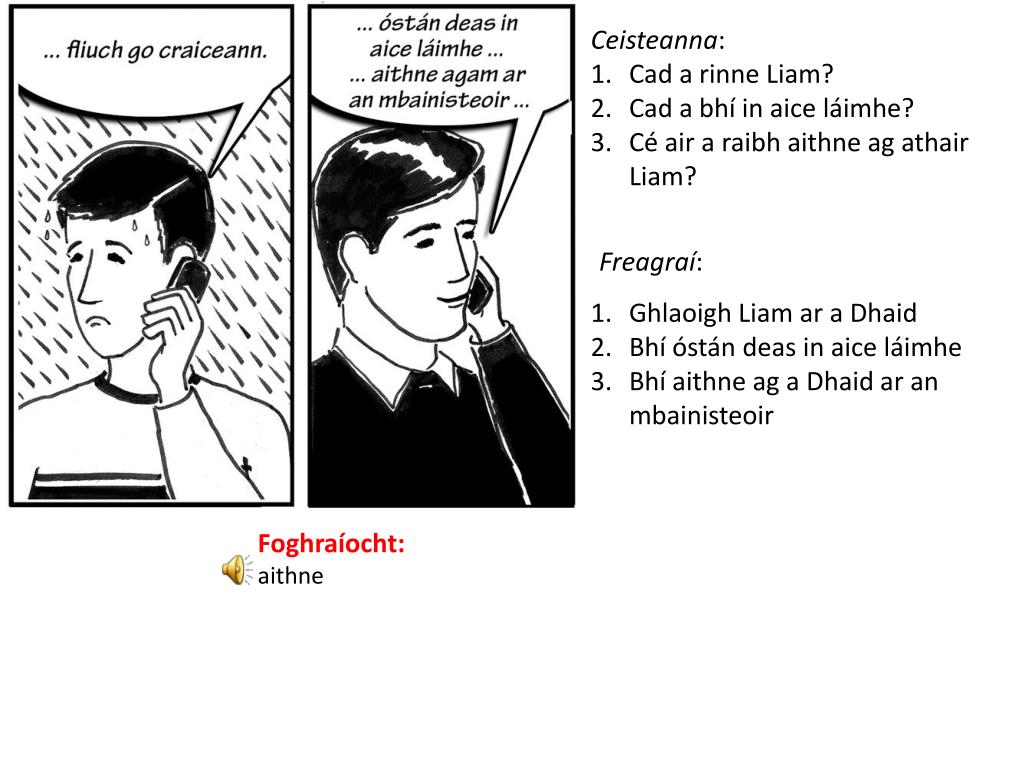 Ceisteanna: Cad a rinne Liam? Cad a bhí in aice láimhe? Cé air a raibh aithne ag athair Liam? Freagraí: Ghlaoigh Liam ar a Dhaid Bhí óstán deas in aice láimhe Bhí aithne ag a Dhaid ar an mbainisteoir Foghraíocht: aithne