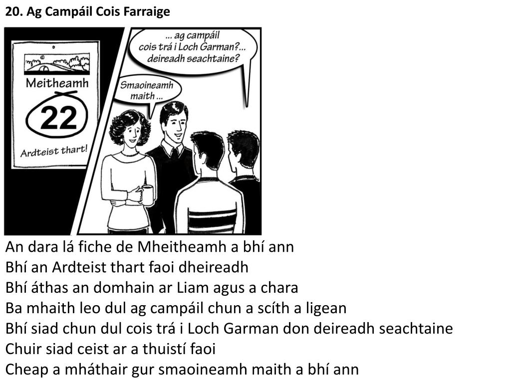 20. Ag Campáil Cois Farraige Ceisteanna: Cén dáta a bhí ann? Cad a tharla an lá sin? Cé a bhí ag caint leis na buachaillí? Cá raibh na buachaillí ag dul ag campáil? Cén fhad a raibh siad chun dul? Cad a cheap a mháthair faoin bplean? Freagraí: An dara lá fiche de Mheitheamh a bhí ann Chríochnaigh an Ardteist. Bhí an Ardteist thart an lá sin Bhí tuistí Liam ag caint leo Bhí siad ag dul ag campáil i Loch Garman Bhí siad chun dul don deireadh seachtaine Cheap sí gur smaoineamh maith a bhí ann Foghraíocht: Loch Garman