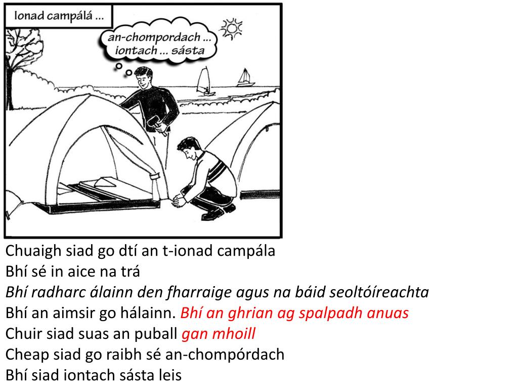 20. Ag Campáil Cois Farraige An dara lá fiche de Mheitheamh a bhí ann Bhí an Ardteist thart faoi dheireadh Bhí áthas an domhain ar Liam agus a chara Ba mhaith leo dul ag campáil chun a scíth a ligean Bhí siad chun dul cois trá i Loch Garman don deireadh seachtaine Chuir siad ceist ar a thuistí faoi Cheap a mháthair gur smaoineamh maith a bhí ann