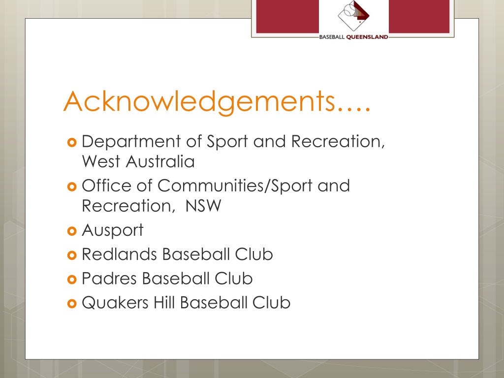 Acknowledgements…. • Department of Sport and Recreation, West Australia • Office of Communities/Sport and Recreation, NSW • Ausport • Redlands Baseball Club • Padres Baseball Club • Quakers Hill Baseball Club