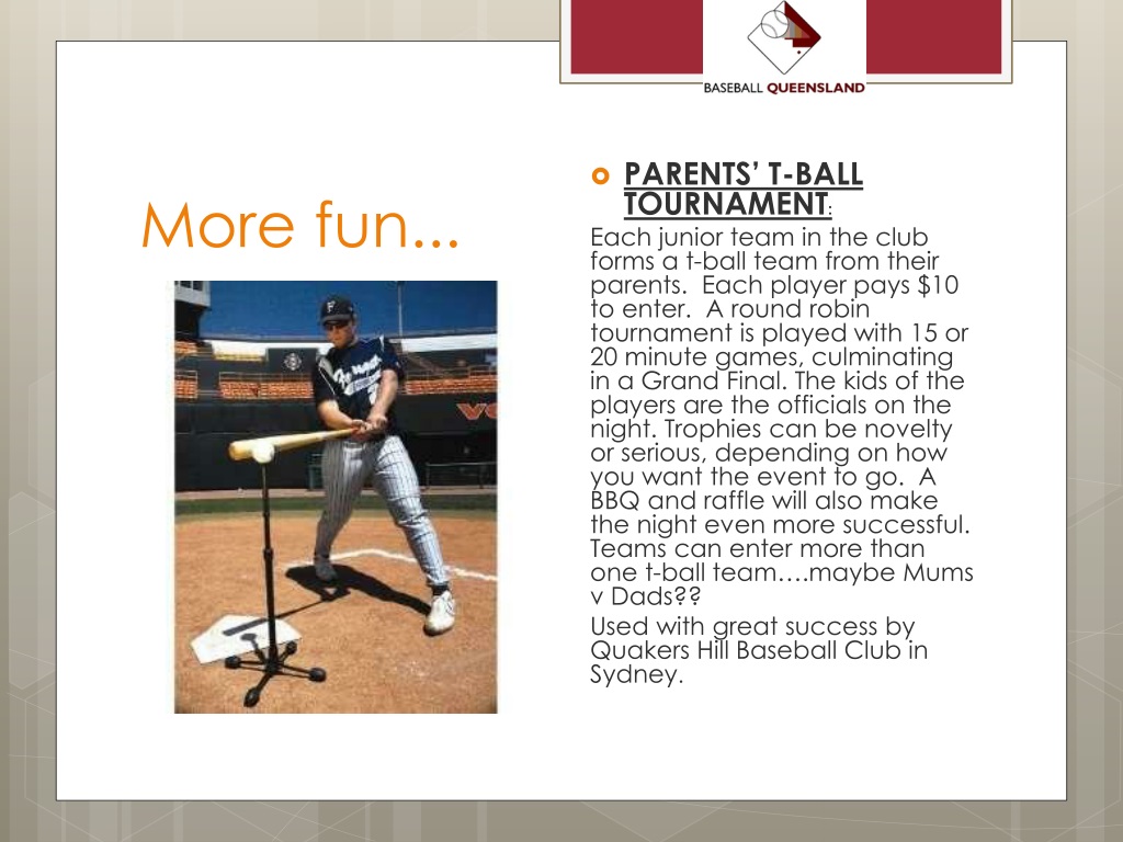 More fun... • PARENTS’ T-BALL TOURNAMENT: Each junior team in the club forms a t-ball team from their parents. Each player pays $10 to enter. A round robin tournament is played with 15 or 20 minute games, culminating in a Grand Final. The kids of the players are the officials on the night. Trophies can be novelty or serious, depending on how you want the event to go. A BBQ and raffle will also make the night even more successful. Teams can enter more than one t-ball team….maybe Mums v Dads?? Used with great success by Quakers Hill Baseball Club in Sydney.