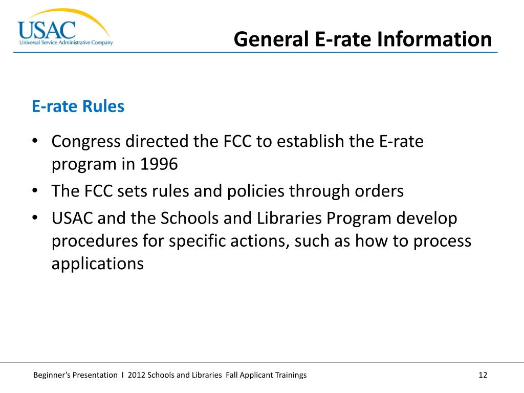Congress directed the FCC to establish the E-rate program in 1996 • TheFCC sets rules and policies through orders • USAC and the Schools and Libraries Program develop procedures for specific actions, such as how to process applications • E-rate Rules • General E-rate Information