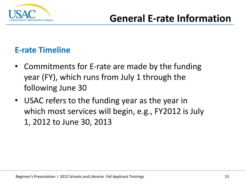 Commitments for E-rate are made by the funding year (FY), which runs from July 1 through the following June 30 • USAC refers to the funding year as the year in which most services will begin, e.g., FY2012 is July 1, 2012 to June 30, 2013 • E-rate Timeline • General E-rate Information