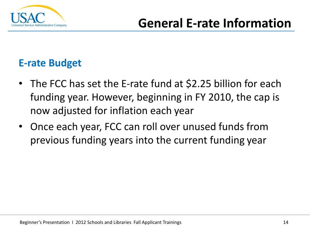 The FCC has set the E-rate fund at $2.25 billion for each funding year. However, beginning in FY 2010, the cap is now adjusted for inflation each year • Once each year, FCC can roll over unused funds from previous funding years into the current funding year • E-rate Budget • General E-rate Information