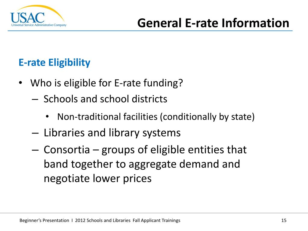 Who is eligible for E-rate funding? • Schools and school districts • Non-traditional facilities (conditionally by state) • Libraries and library systems • Consortia – groups of eligible entities that band together to aggregate demand and negotiate lower prices • E-rate Eligibility • General E-rate Information