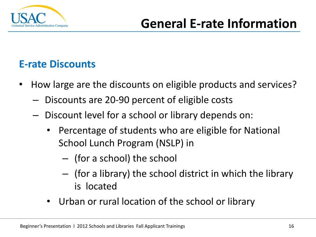 How large are the discounts on eligible products and services? • Discounts are 20-90 percent of eligible costs • Discount level for a school or library depends on: • Percentage of students who are eligible for National School Lunch Program (NSLP) in • (for a school) the school • (for a library) the school district in which the library is located • Urban or rural location of the school or library • E-rate Discounts • General E-rate Information