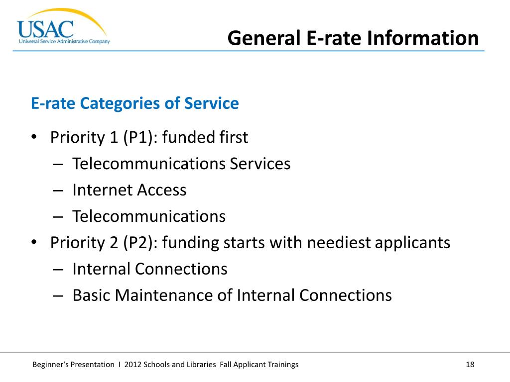 Priority 1 (P1): funded first • Telecommunications Services • Internet Access • Telecommunications • Priority 2 (P2): funding starts with neediest applicants • Internal Connections • Basic Maintenance of Internal Connections • E-rate Categories of Service • General E-rate Information