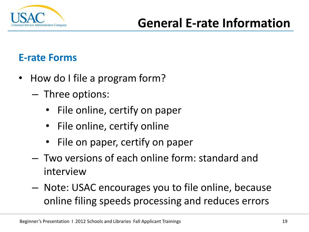 How do I file a program form? • Three options: • File online, certify on paper • File online, certify online • File on paper, certify on paper • Two versions of each online form: standard and interview • Note:USAC encourages you to file online, because online filing speeds processing and reduces errors • E-rate Forms • General E-rate Information