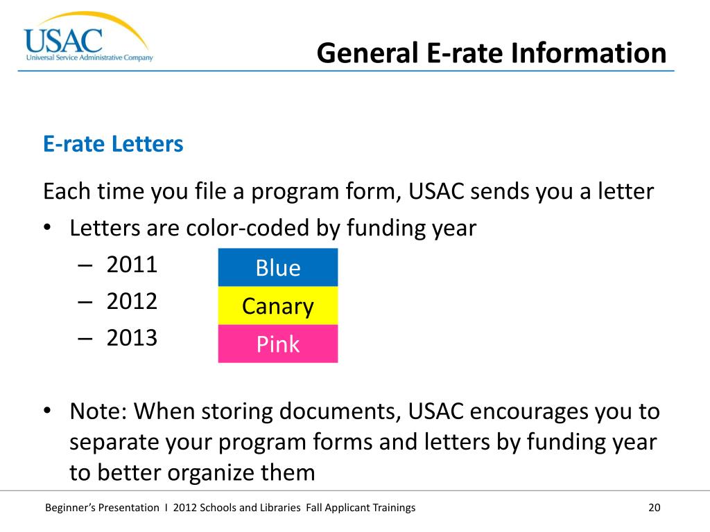 Each time you file a program form, USAC sends you a letter • Letters are color-coded by funding year • 2011 • 2012 • 2013 • Note: When storing documents, USAC encourages you to separate your program forms and letters by funding year to better organize them • E-rate Letters • General E-rate Information Blue Canary Pink