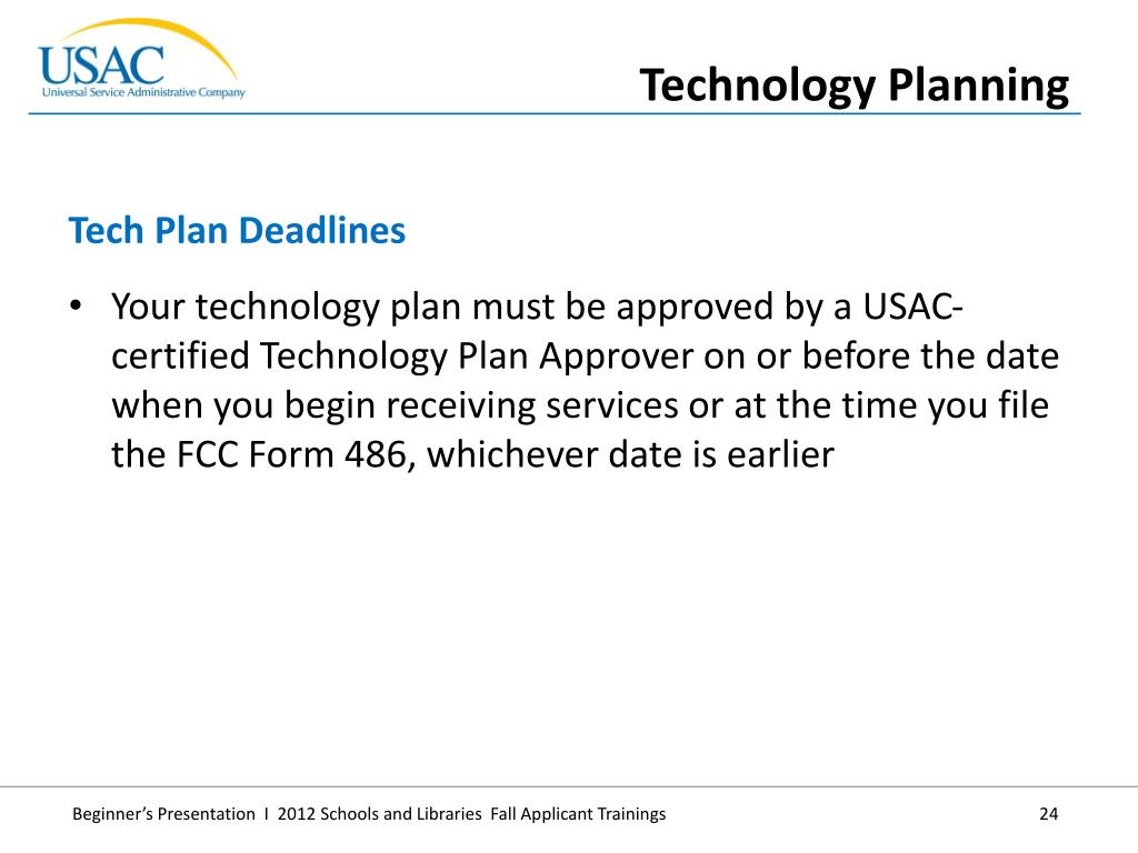 Your technology plan must be approved by a USAC-certified Technology Plan Approver on or before the date when you begin receiving services or at the time you file the FCC Form 486, whichever date is earlier • Tech Plan Deadlines • Technology Planning