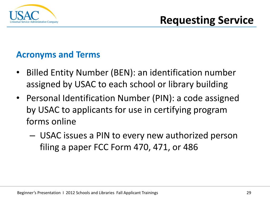 Billed Entity Number (BEN): an identification number assigned by USAC to each school or library building • Personal Identification Number (PIN): a code assigned by USAC to applicants for use in certifying program forms online • USAC issues a PIN to every new authorized person filing a paper FCC Form 470, 471, or 486 • Acronyms and Terms • Requesting Service