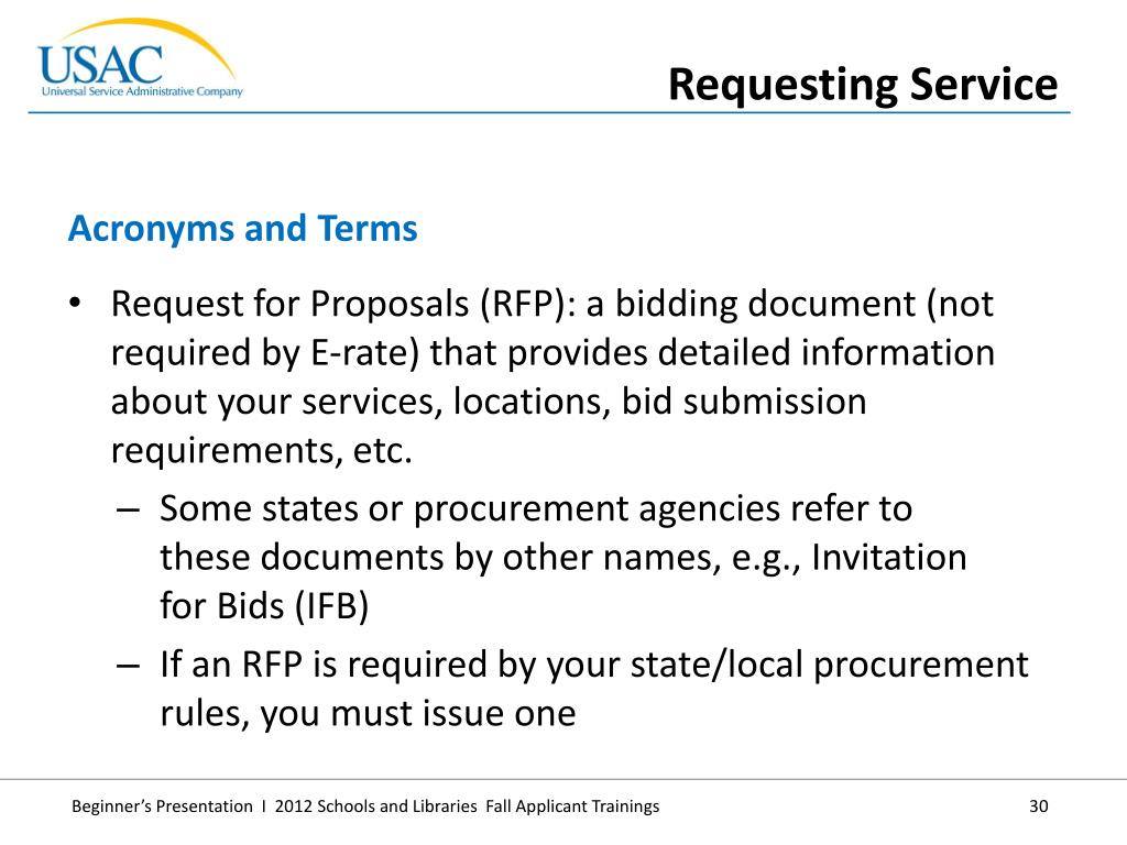 Request for Proposals (RFP): a bidding document (not required by E-rate) that provides detailed information about your services, locations, bid submission requirements, etc. • Some states or procurement agencies refer to these documents by other names, e.g., Invitation for Bids (IFB) • If an RFP is required by your state/local procurement rules, you must issue one • Acronyms and Terms • Requesting Service
