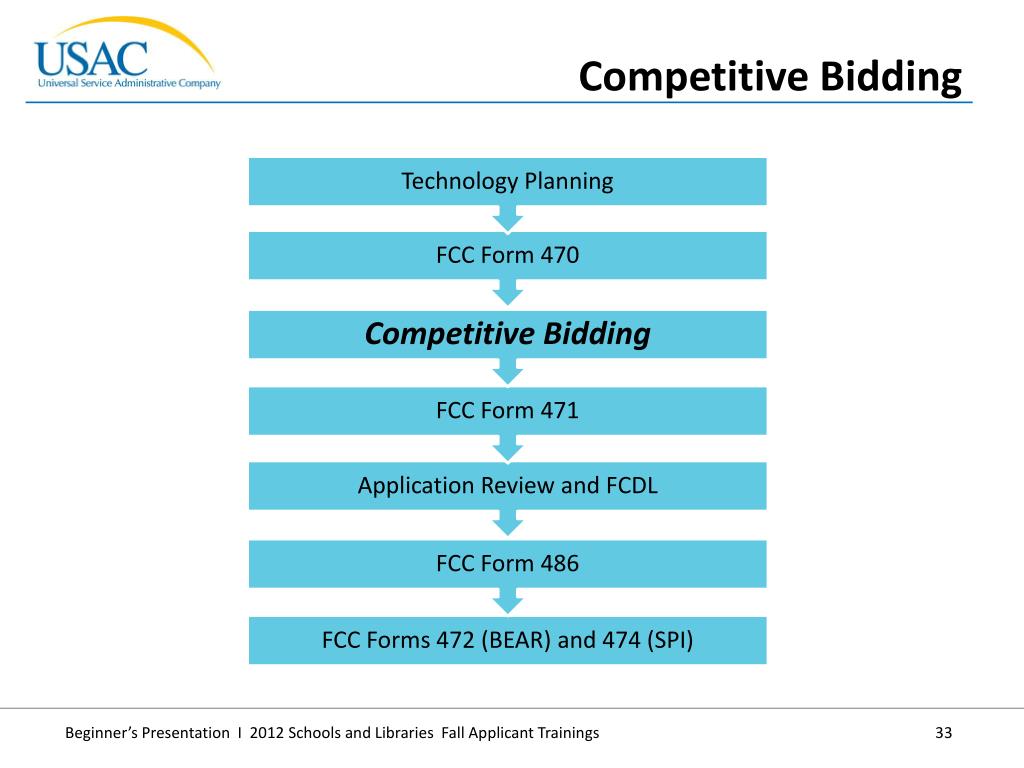 Bid: A service provider response to your FCC Form 470 and/or RFP that contains services and prices and any other information you have requested • Price of eligible products and services as the primary factor: In evaluating bids, the price of the eligible products and services must be the most heavily weighted factor in your evaluation of bids • Acronyms and Terms • Competitive Bidding