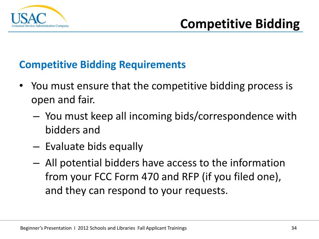 You must ensure that the competitive bidding process is open and fair. • You must keep all incoming bids/correspondence with bidders and • Evaluate bids equally • All potential bidders have access to the information from your FCC Form 470 and RFP (if you filed one), and they can respond to your requests. • Competitive Bidding Requirements • Competitive Bidding