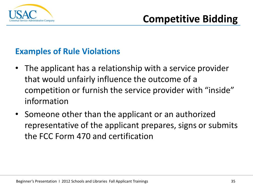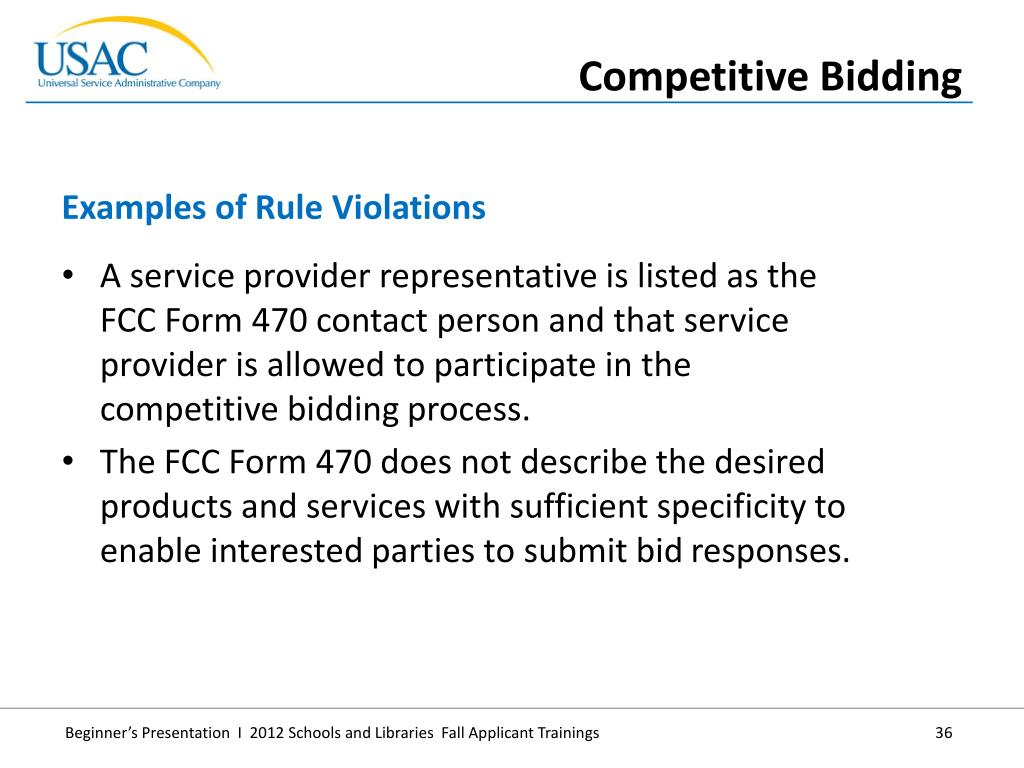 A service provider representative is listed as the FCC Form 470 contact person and that service provider is allowed to participate in the competitive bidding process. • The FCC Form 470 does not describe the desired products and services with sufficient specificity to enable interested parties to submit bid responses. • Examples of Rule Violations • Competitive Bidding